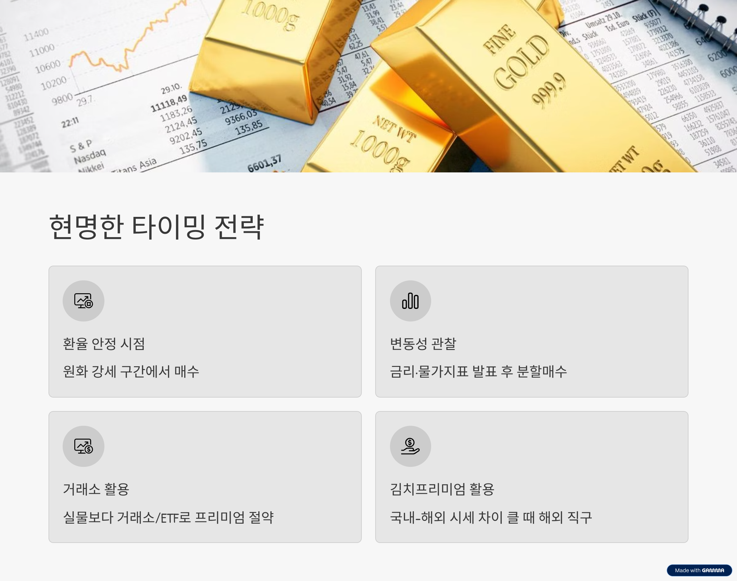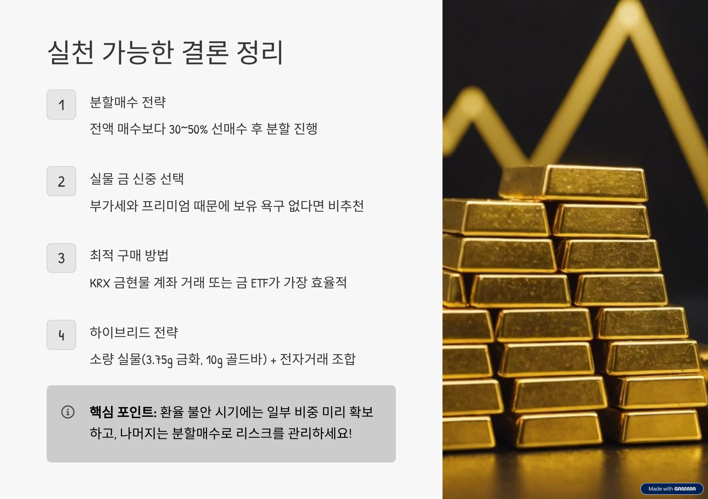 - 실물 소유가 필요하다면 소량(예: 3.75g 금화, 10g 골드바)만 상징적으로 보유하고, 나머지는 전자 거래로 관리하는 것이 현명합니다.
