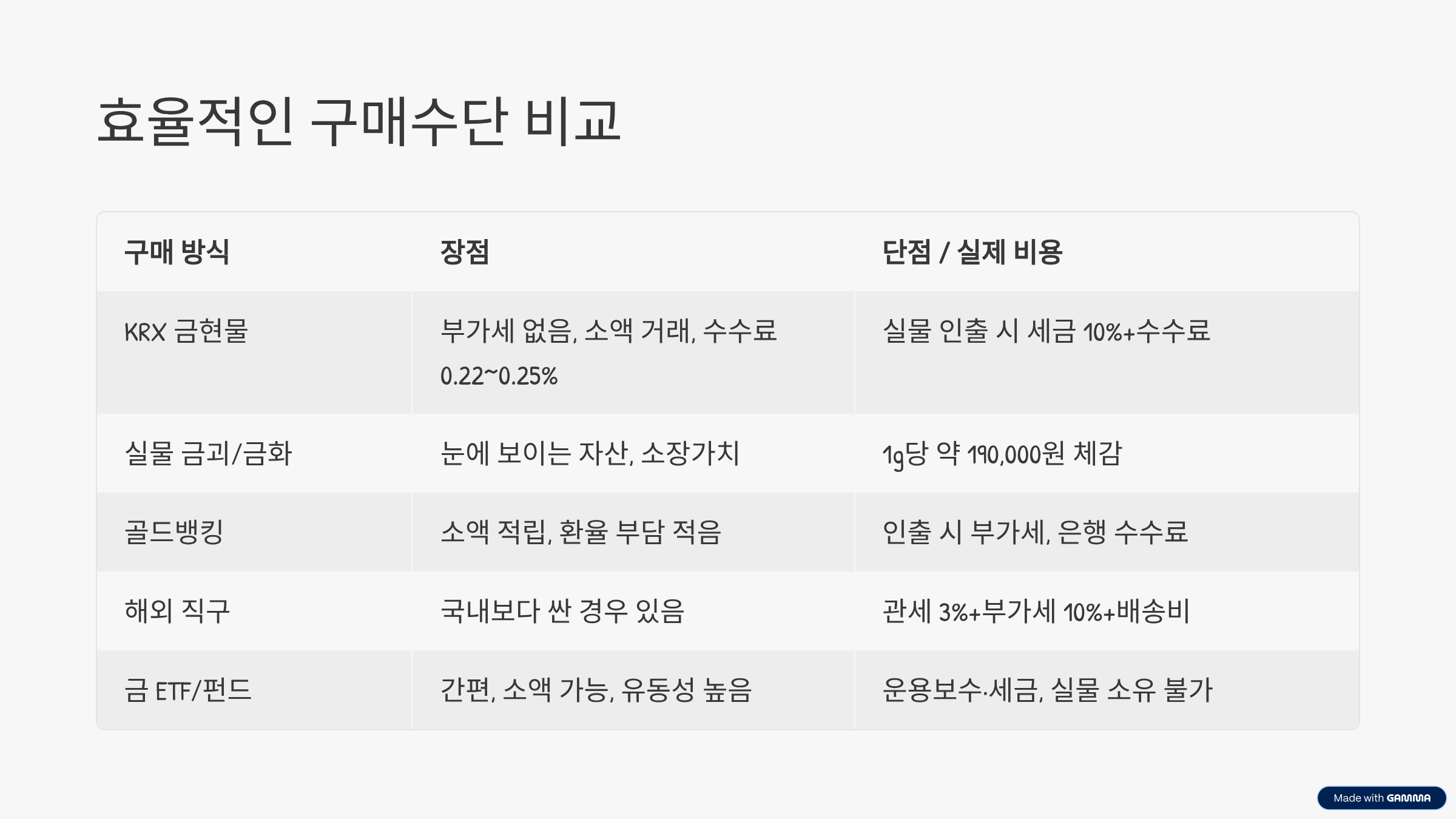 - 세금: 실물 금은 부가세 10%가 붙습니다. KRX 금현물 계좌 거래는 면세예요.